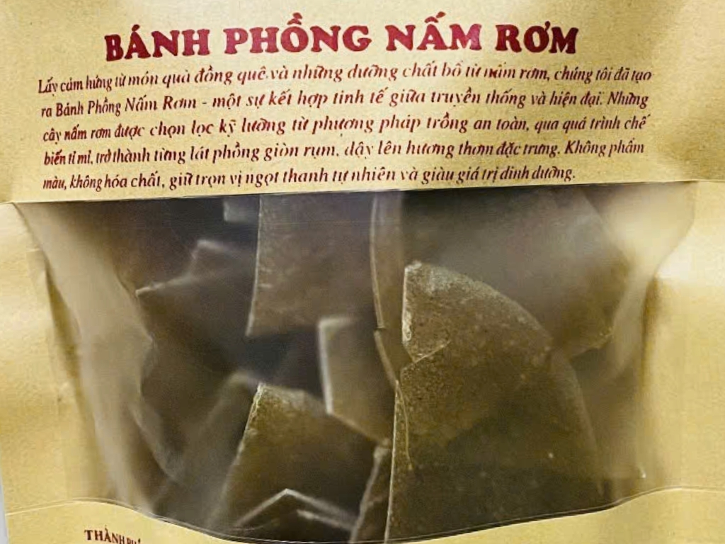 Nấm rơm tươi được tuyển chọn kỹ lưỡng từ vùng nguyên liệu an toàn, qua quy trình chế biến công phu, được ép mỏng tự nhiên, không chiên, tạo thành những lát bánh giòn rụm, thơm nức mùi nấm. Sản phẩm không sử dụng chất tạo màu, không hóa chất bảo quản, giữ trọn vị ngọt thanh tự nhiên và hậu vị bùi bùi hấp dẫn.