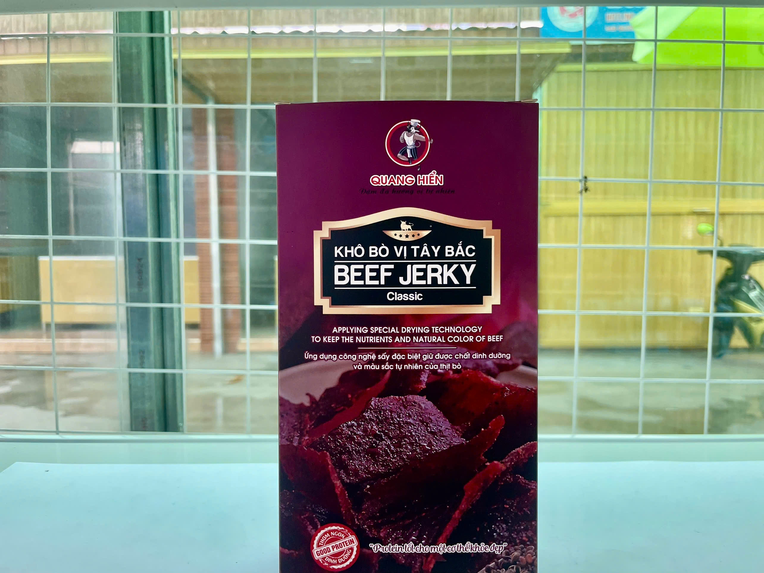 Khô Bò Vị Tây Bắc Beef Jerky (Classic) của thương hiệu Quang Hiển là món ăn vặt hấp dẫn, được chế biến từ thịt bò chất lượng cao, kết hợp với gia vị đặc trưng của vùng Tây Bắc. Sản phẩm áp dụng công nghệ sấy đặc biệt giúp giữ nguyên dưỡng chất và hương vị tự nhiên của thịt bò. Với độ dai vừa phải, vị cay nhẹ cùng mùi thơm đặc trưng, đây là lựa chọn hoàn hảo cho những ai yêu thích đặc sản khô bò truyền thống.