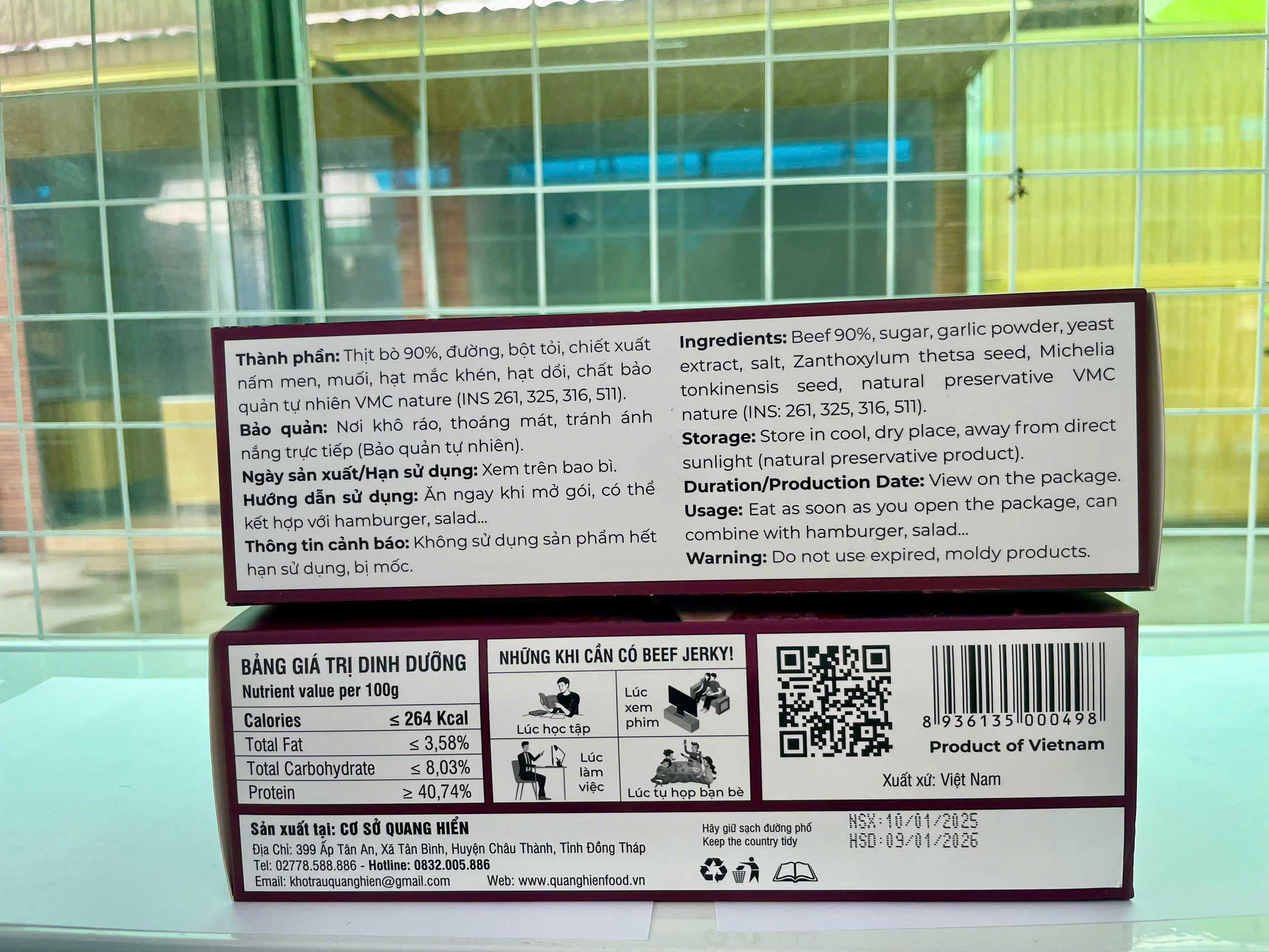 Khô Bò Vị Tây Bắc Quang Hiển được làm từ thịt bò chất lượng cao, tẩm ướp gia vị đặc trưng và sấy hiện đại, giữ trọn dưỡng chất và hương vị tự nhiên. Sản phẩm dai mềm, cay nhẹ, thơm ngon, thích hợp làm món ăn vặt, bổ sung năng lượng hoặc quà biếu ý nghĩa. Đóng gói tiện lợi, dễ mang theo, bao gồm: