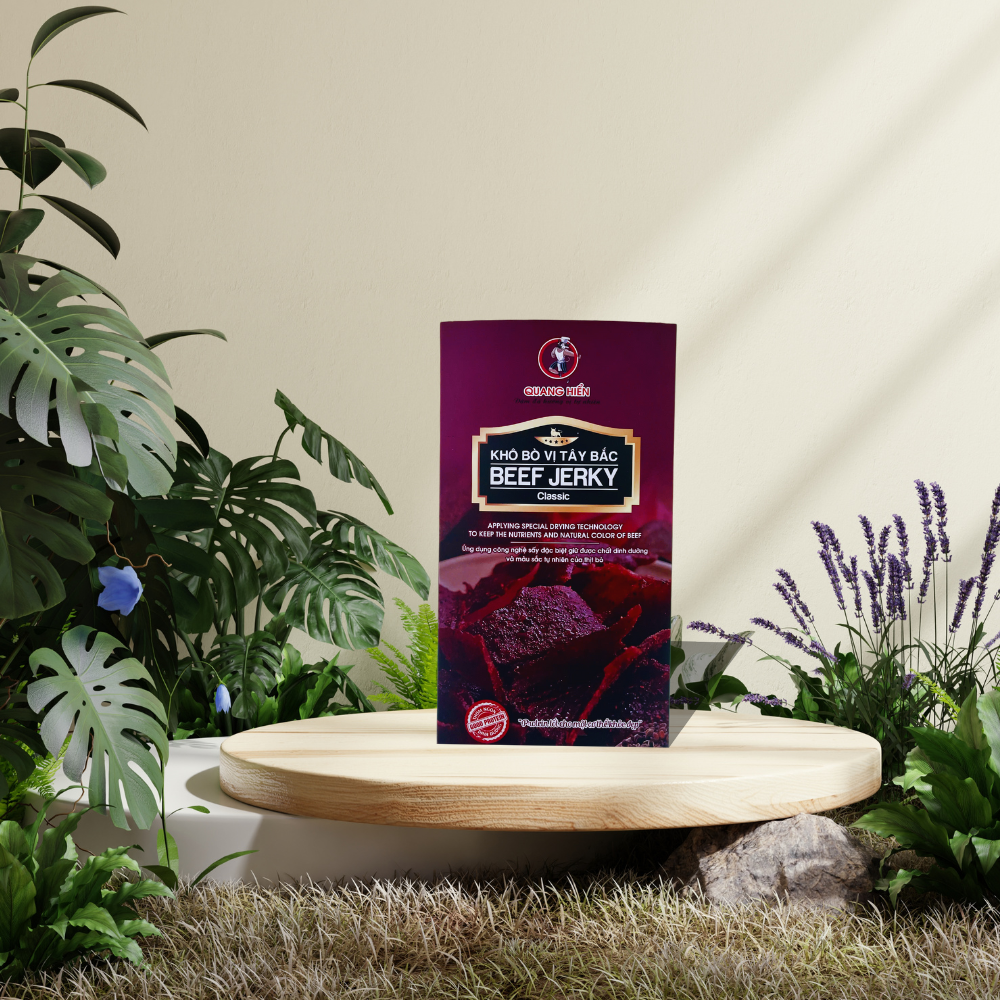 Khô Bò Vị Tây Bắc Beef Jerky (Classic) của thương hiệu Quang Hiển là sản phẩm được chế biến từ thịt bò nguyên chất, áp dụng công nghệ sấy đặc biệt giúp giữ nguyên giá trị dinh dưỡng và màu sắc tự nhiên. Với hương vị đặc trưng của vùng Tây Bắc, sản phẩm mang đến trải nghiệm ẩm thực thơm ngon, dai mềm và đậm đà gia vị