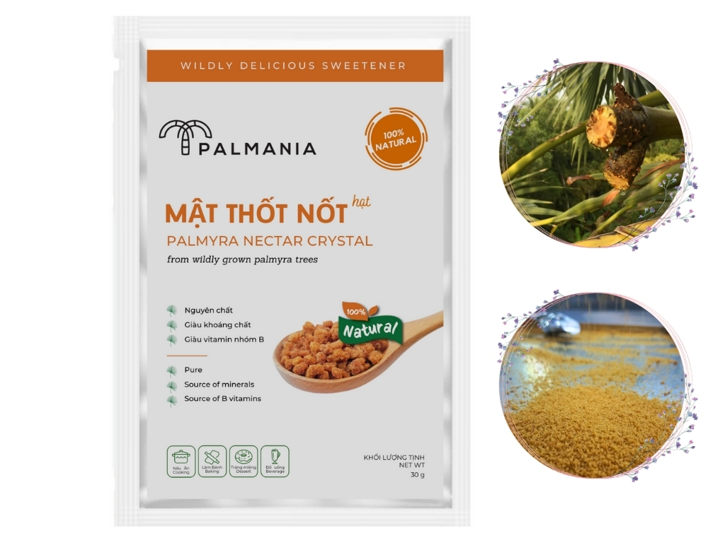 Crystallized from the nectar of wild Palmyra palm flowers growing naturally in the sacred Bảy Núi (Seven Mountains) region of An Giang, Palmania Crystallized Palmyra Nectar 150g brings a naturally mild sweetness with subtle notes reminiscent of salted car