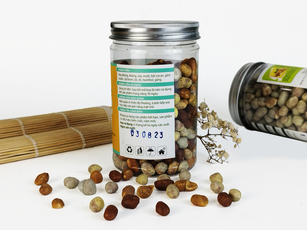 - Thành phần: đậu phộng, đường, sữa, muối, bột cacao, gôm arabic, bột kem, tỏi, ớt, menthol, gừng.