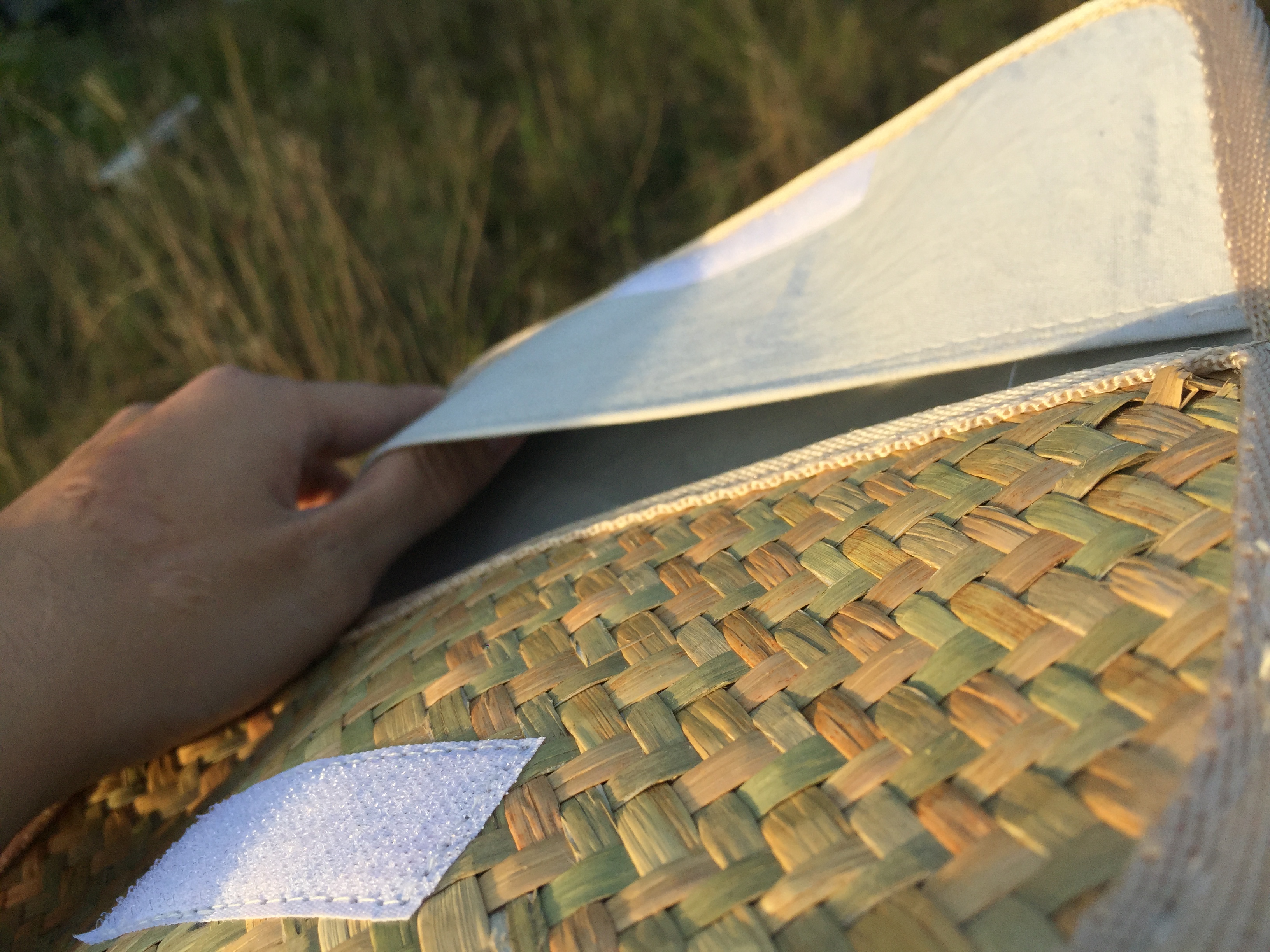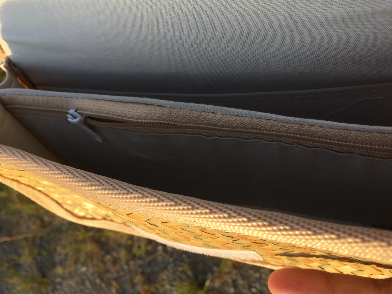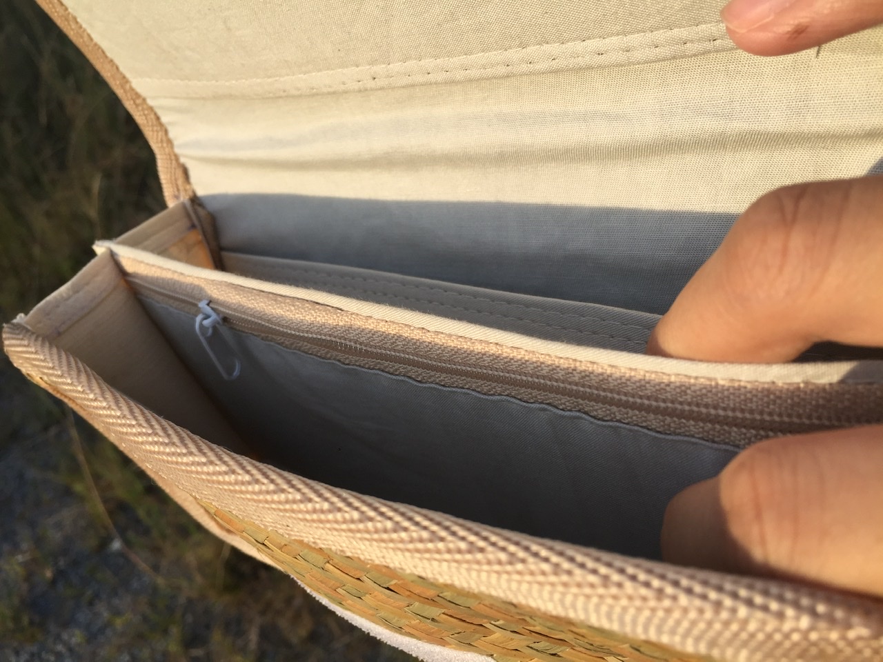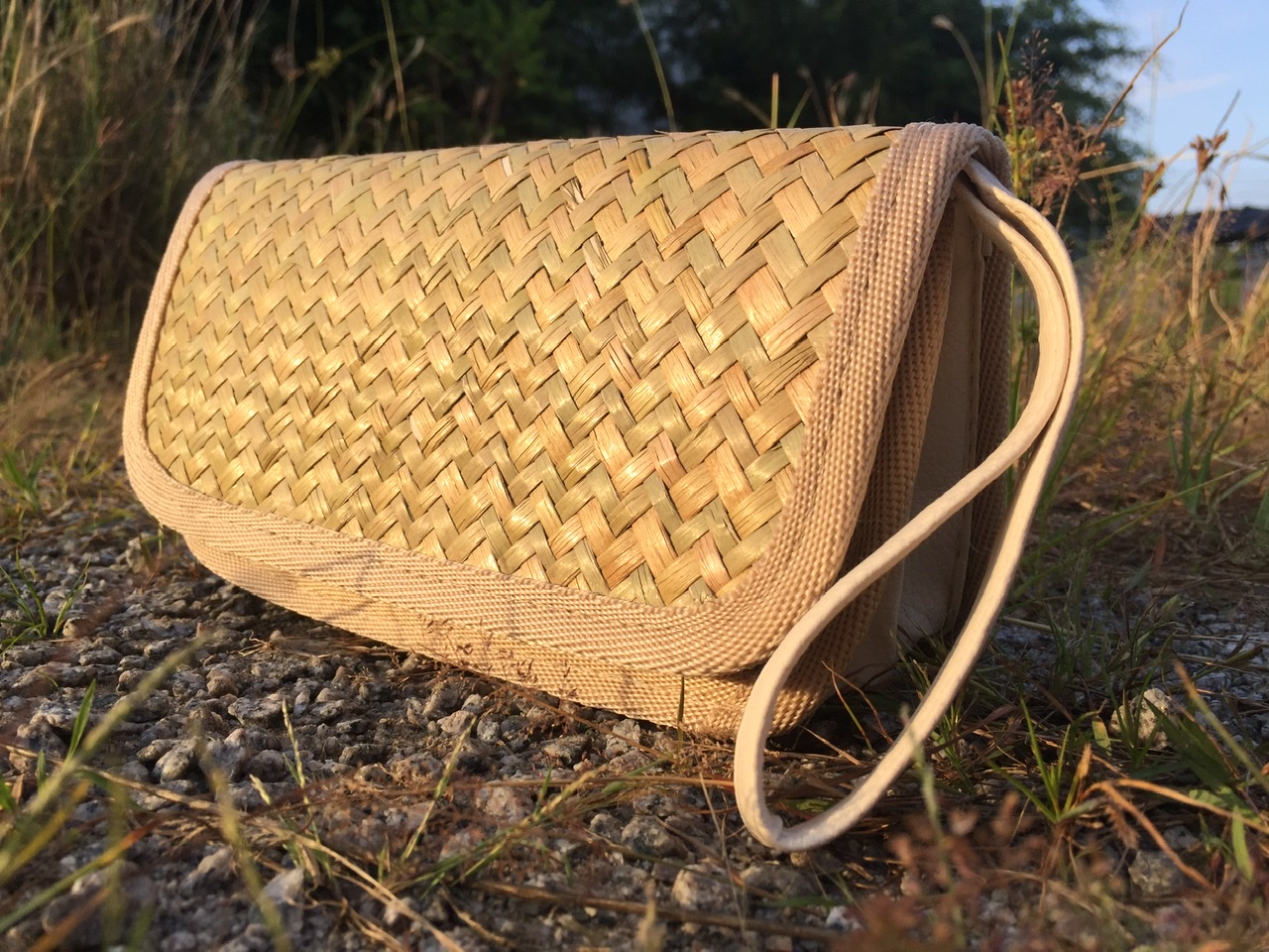 Ví cầm tay được làm từ cỏ bàng tự nhiên 100%, được đan thủ công bởi người dân địa phương