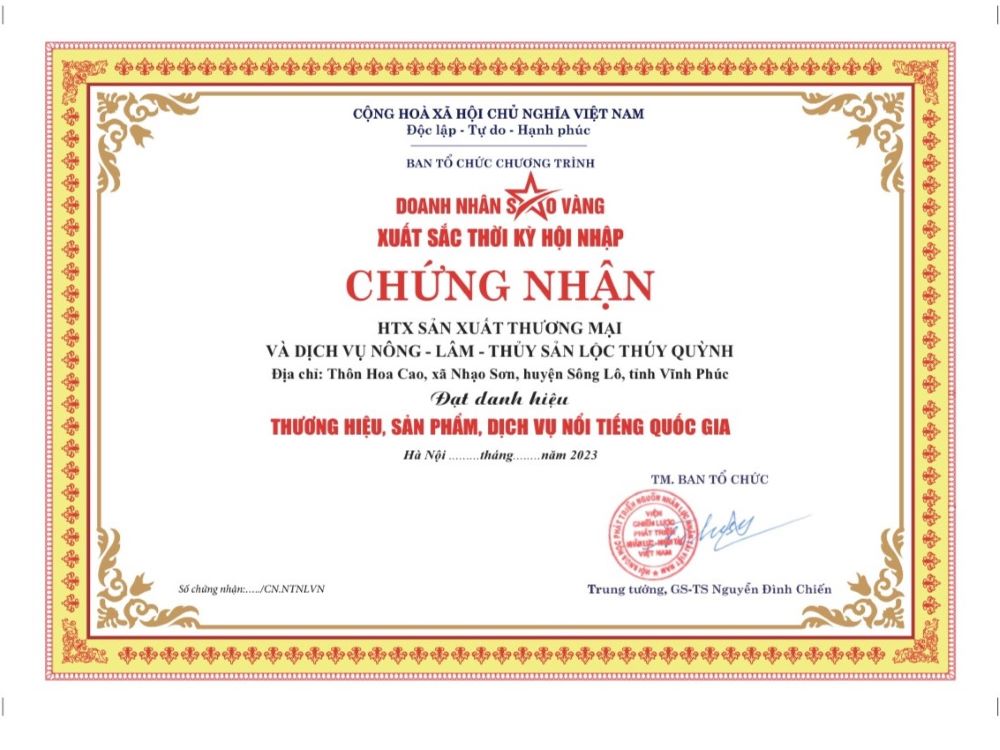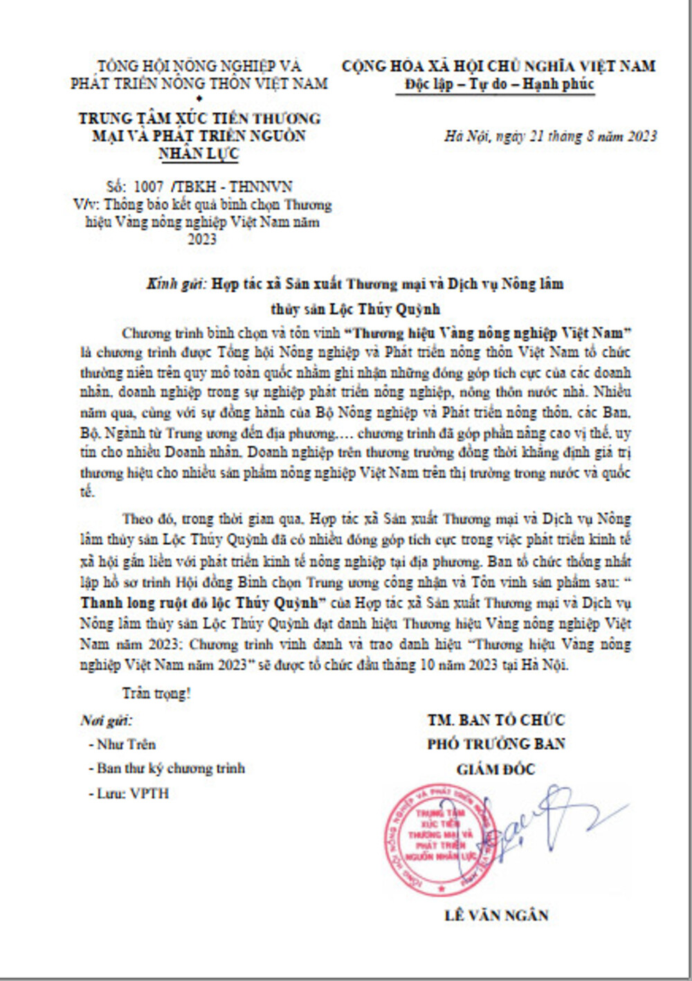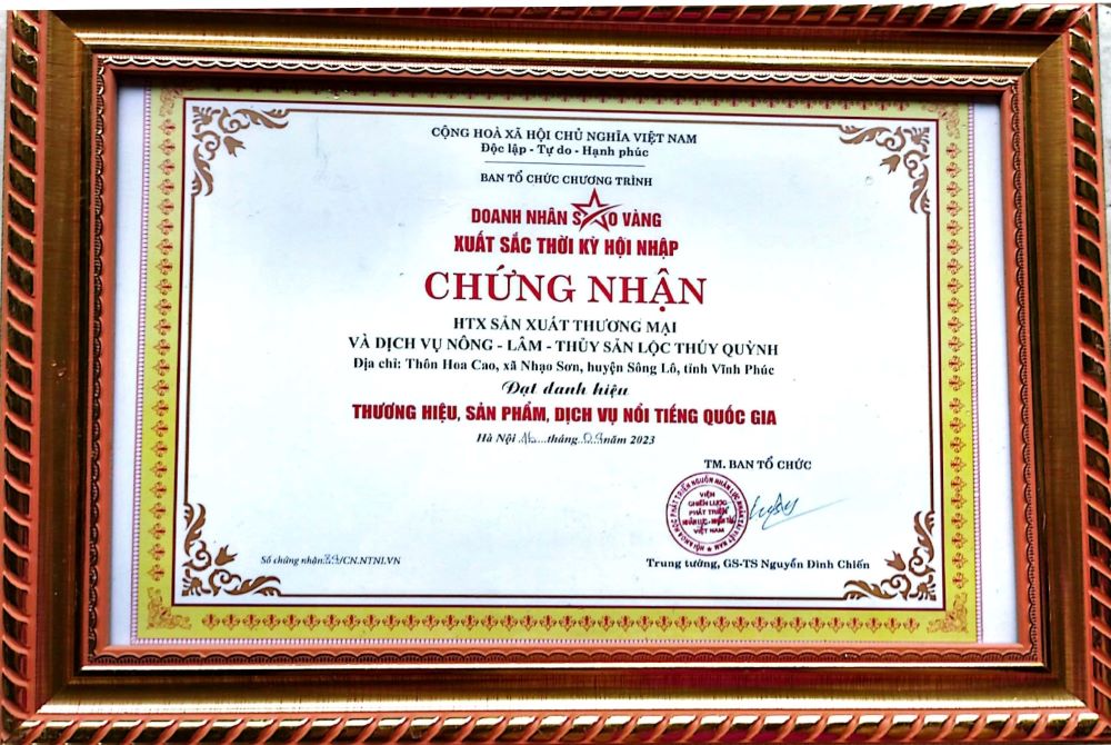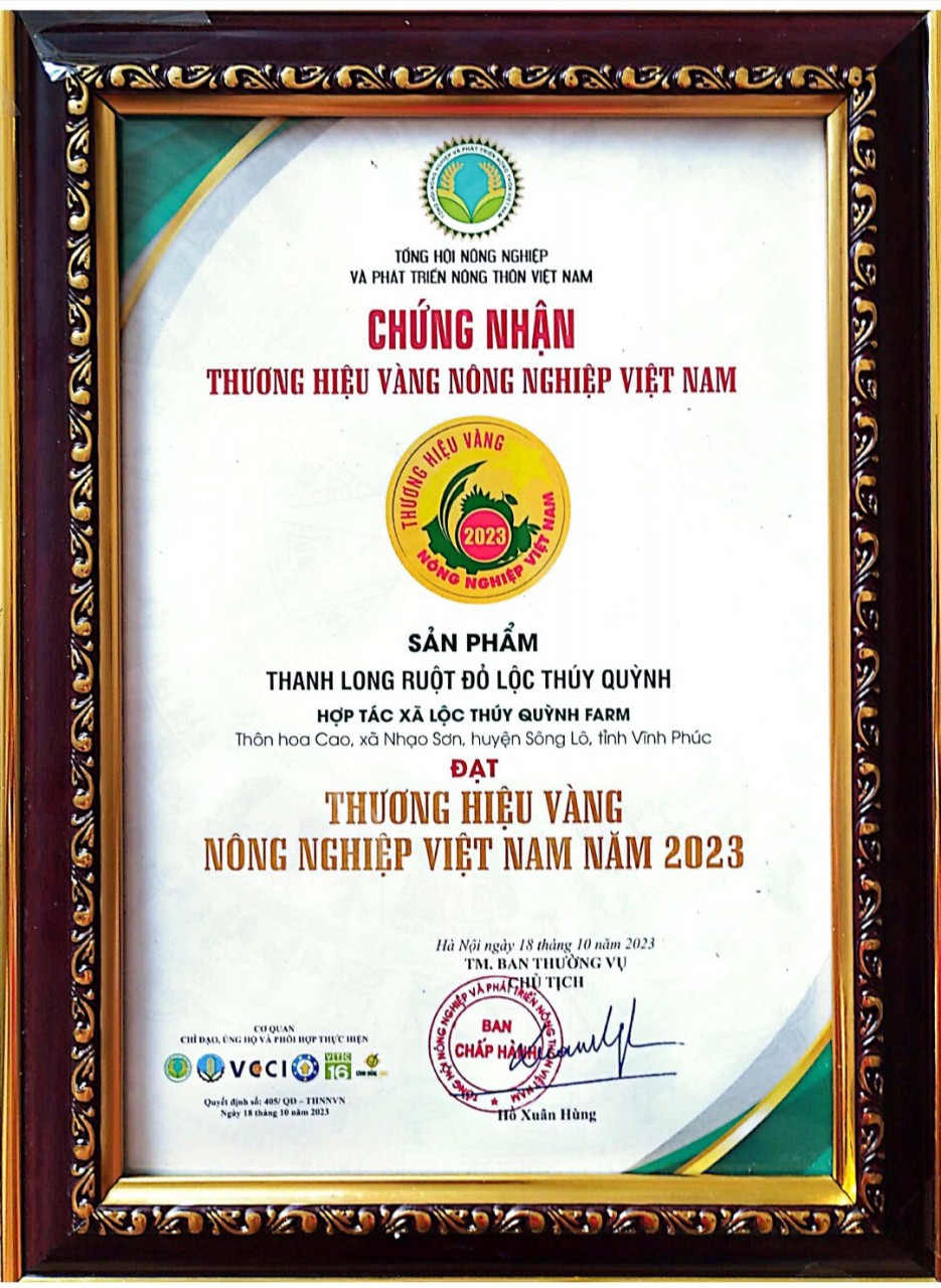 Hợp tác xã Lộc Thúy Quỳnh đạt thương hiệu vàng nông nghiệp Việt Nam năm 2023.