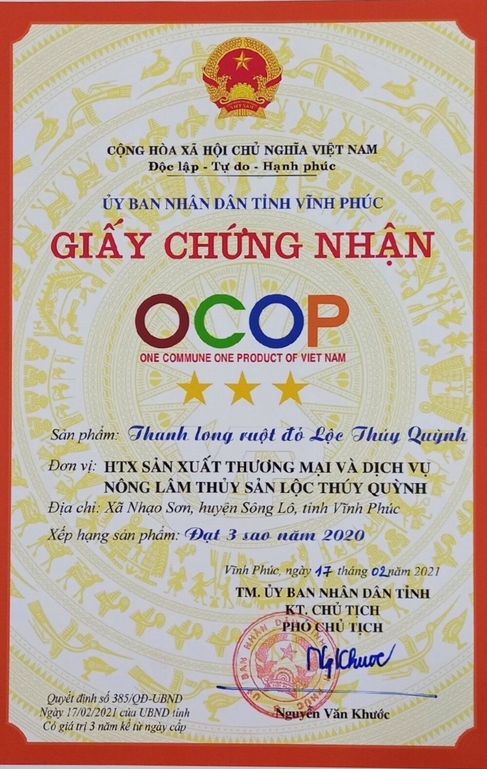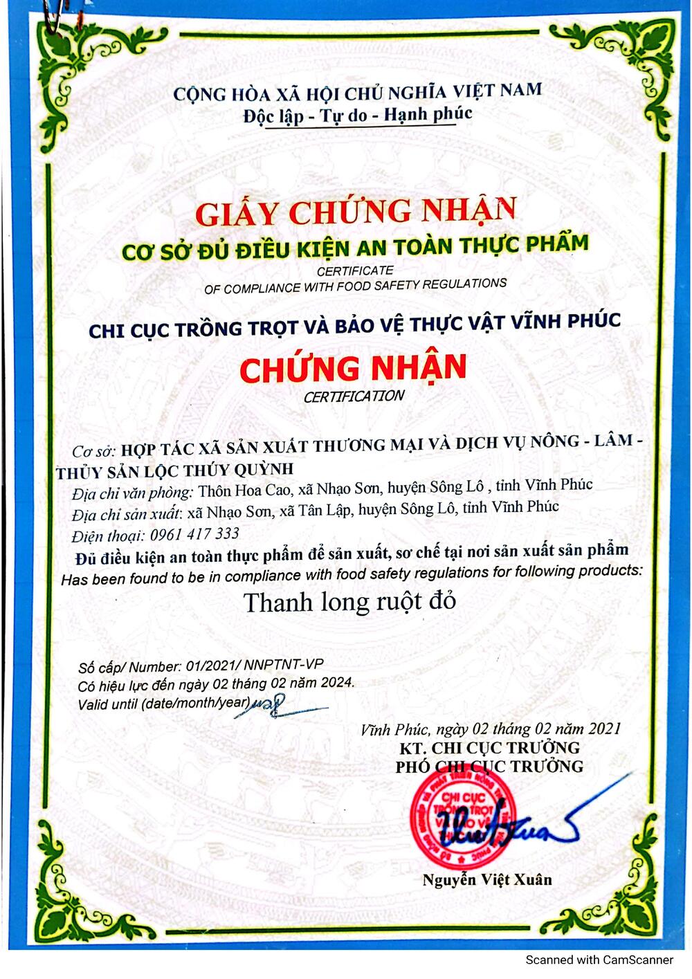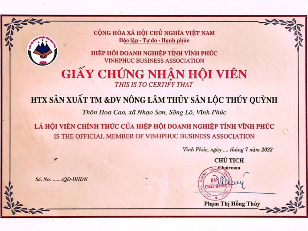 Hợp Tác Xã Lộc Thúy Quỳnh Farm được đặt tại mảnh đất hữu tình của Xã Nhạo Sơn, Huyện Sông Lô, tỉnh Vĩnh Phúc, đã nỗ lực không ngừng để mang đến những sản phẩm nông nghiệp chất lượng và bền vững. Với trang web chính thức là nongsanvinhphuc.com, họ đã chứng tỏ tầm nhìn và cam kết của mình đối với sự phục vụ cộng đồng. Bà Trần Thị Thúy - Giám đốc đại diện của hợp tác xã, đã luôn đặt mục tiêu cao cả về sản xuất rau củ sạch. Các sản phẩm như dưa chuột, măng tây xanh và đặc biệt là thanh long, đã trở thành niềm tự hào của họ. Thanh Long ruột đỏ, đạt chuẩn VietGAP và chuẩn Ocop 3 sao vào năm 2021, đã khẳng định vị thế của hợp tác xã trong ngành nông nghiệp.