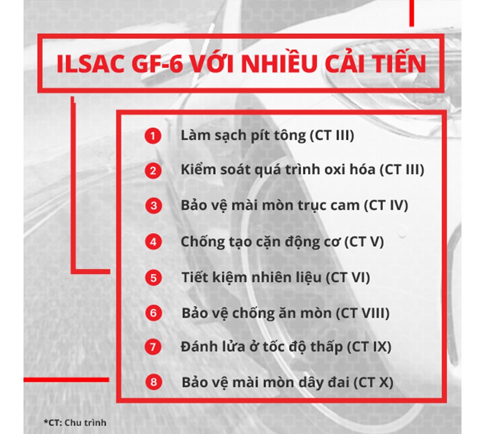 - Cấp chất lượng mới API SP bảo vệ chống Đánh lửa sớm ở tốc độ thấp (LSPI) giúp ngăn ngừa hỏng hóc bên trong động cơ