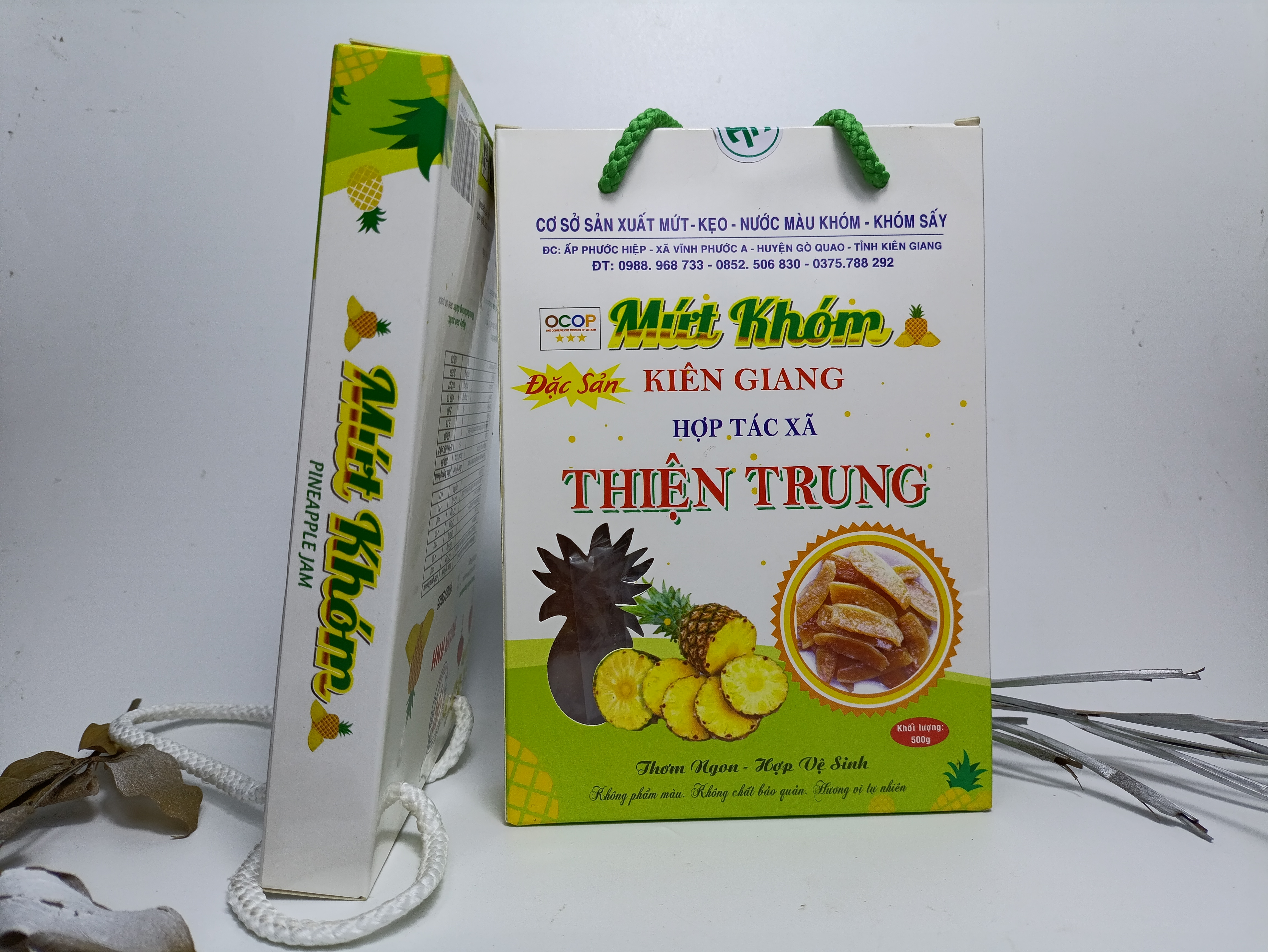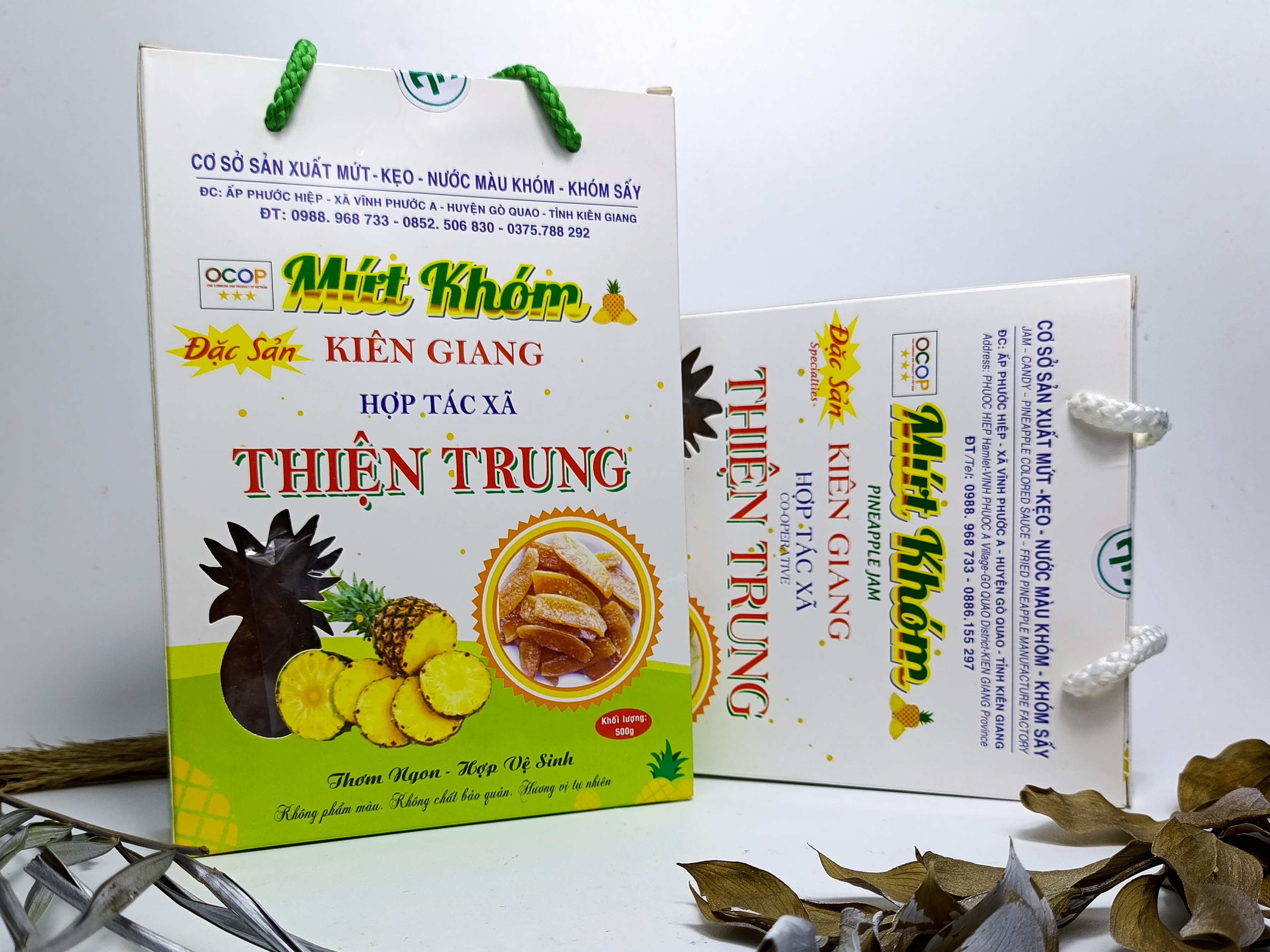 - Sản xuất: Cơ sở sản xuất mứt - kẹo khóm HTX Thiện Trung.