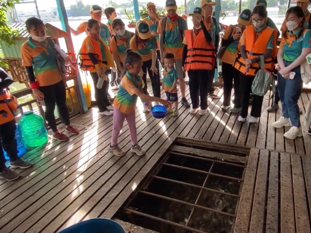 08h00: Sau khi ăn sáng, đoàn tham quan Làng Bè Sắc Màu, dừng bè nuôi cá trên sông, xem và trải nghiệm cho cá ăn.
