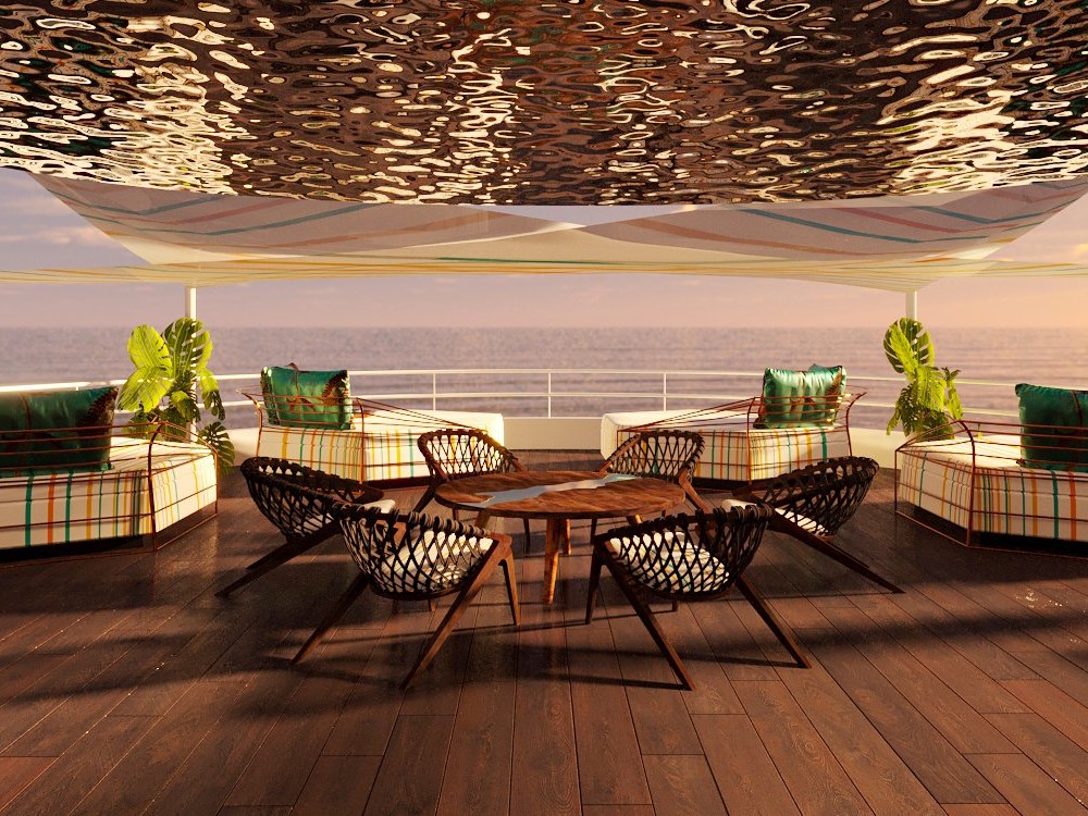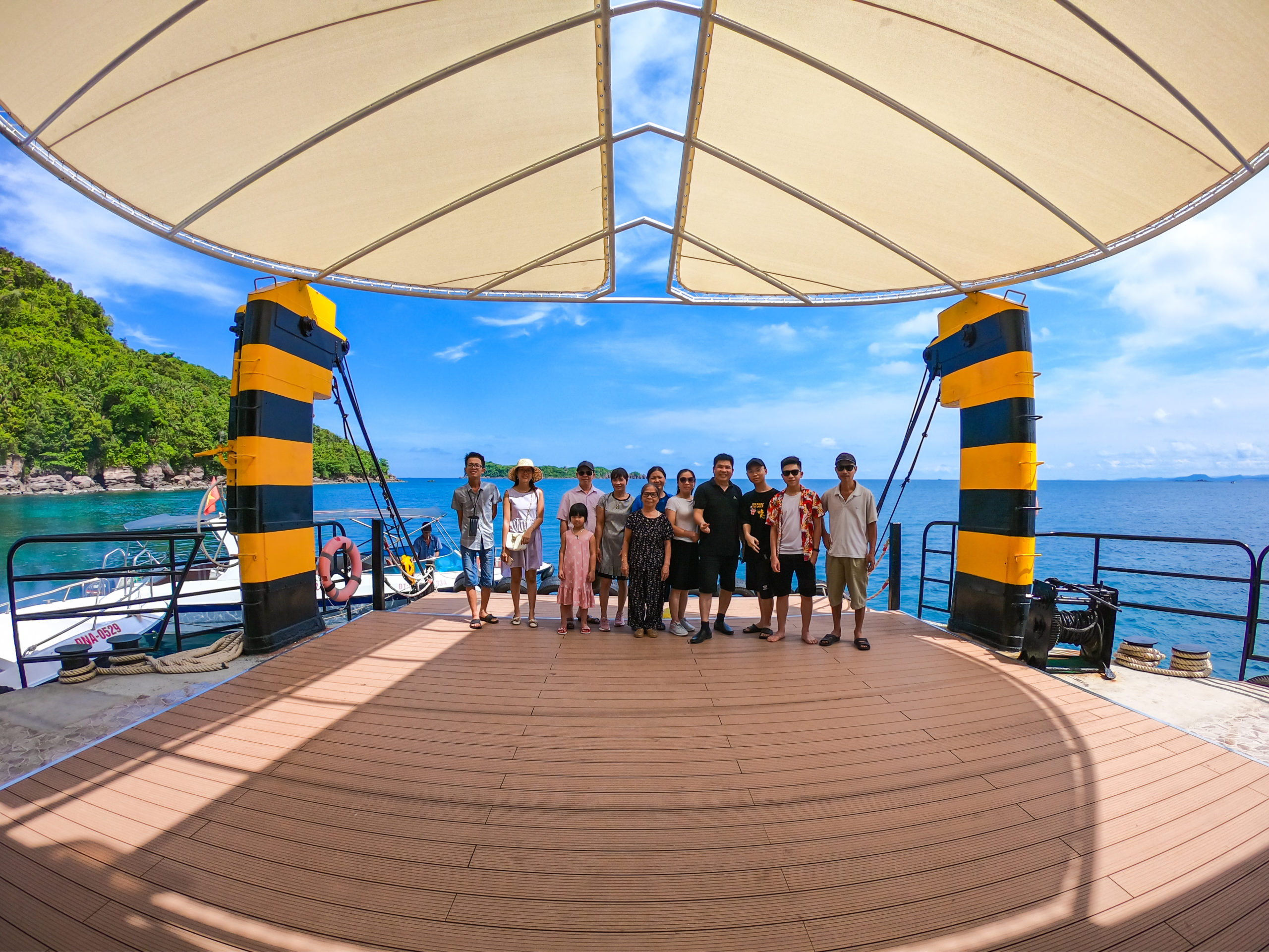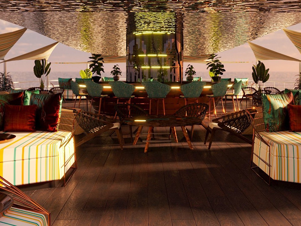 - Tầng 3 thiết kế quán bar view 360 độ để du khách thưởng ngoạn toàn cảnh của vùng biển Phú Quốc trong nhiều khoảnh khắc, check in sang chảnh giữa biển khơi và một không gian kiến trúc độc đáo. Ngoại vi của du thuyền là hệ thống cầu phao phục vụ khách tham quan check in và các môn dịch vụ vui chơi không kém phần hấp dẫn khác: thuyền thúng đáy kính tham quan rạn san hô, jeky, phao chuối…