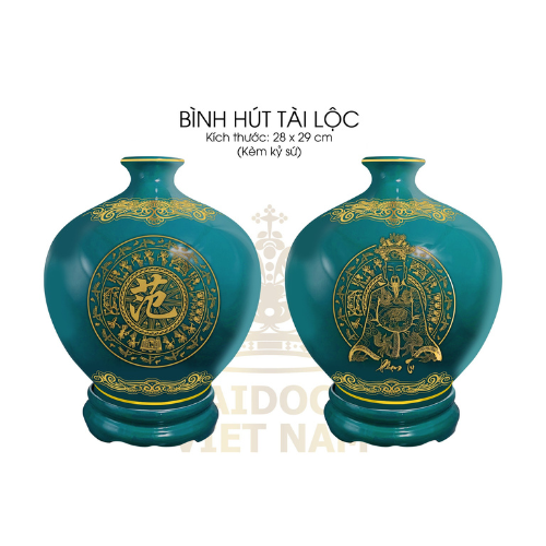 Bình hút tài lộc thường có dáng độc đáo và phong cách truyền thống, hình bình đẹp, với các yếu tố trang trí như ngọc bích, vàng, và các biểu tượng của sự giàu có và tài lộc, đặc biệt là ký hiệu dòng họ Phạm