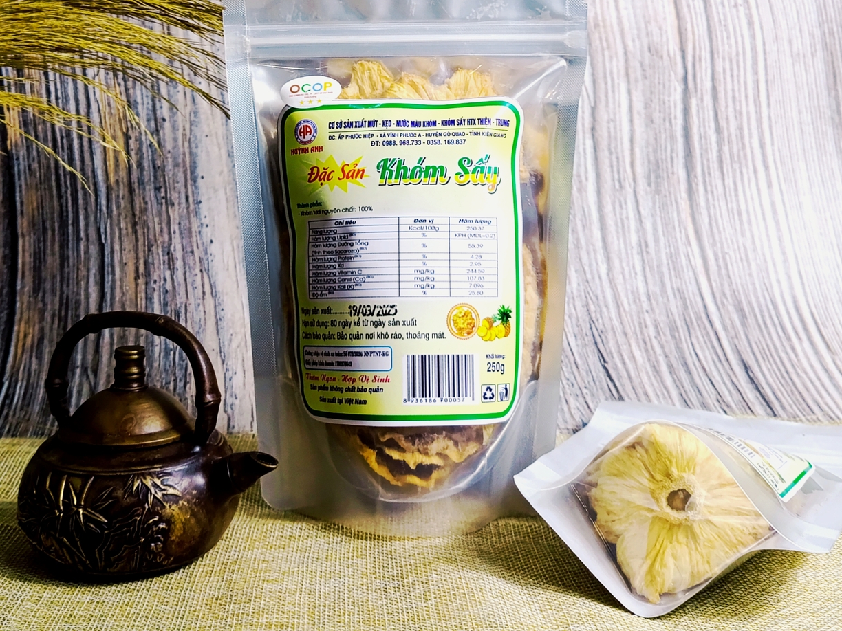 Khóm sấy là sản phẩm được chế biến 100% từ khóm tươi tự nhiên. Đây là món ăn vặt lành mạnh, giàu vitamin và dưỡng chất tốt cho sức khỏe. Vị chua chua, ngọt ngọt đặc trưng của khóm kết hợp với độ dẻo dai vừa phải sau khi sấy sẽ khiến bạn “mê mẩn” ngay từ lần thưởng thức đầu tiên.