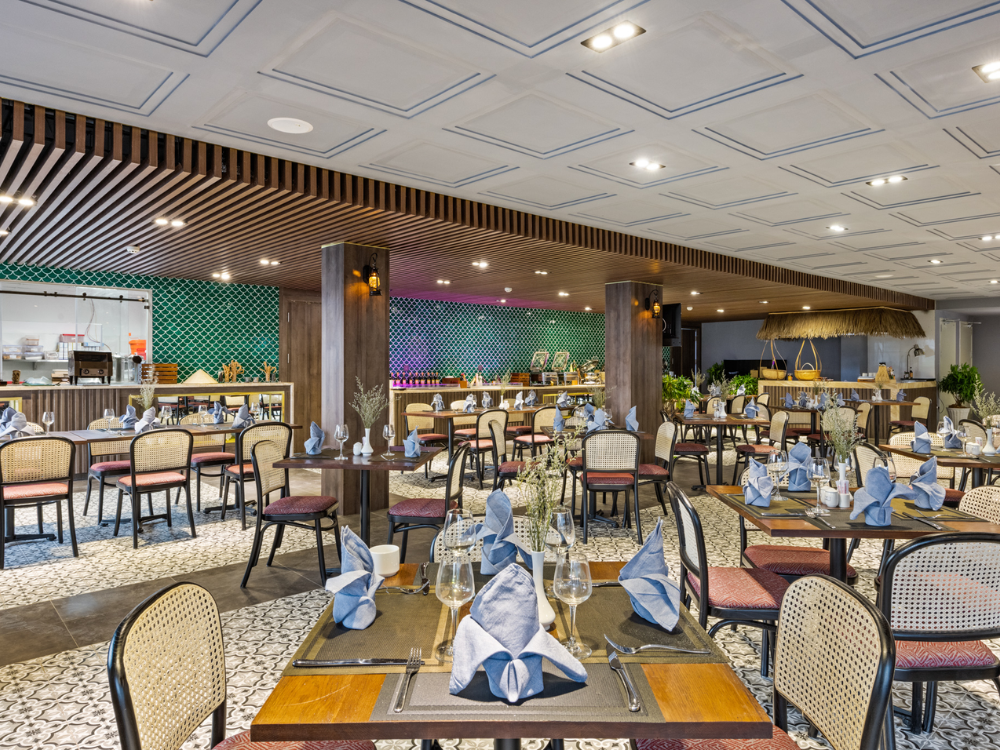 Nhà hàng Soleil Fusion sở hữu lối kiến trúc sang trọng, trang nhã, ấn tượng với không gian 2 tầng rộng rãi, thoáng mát, có sức chứa lên tới 160 thực khách. Tầng 1 là không gian trong nhà chuyên phục vụ buffet với các món ăn Âu, Á đa dạng, những món ăn đặc trưng của mâm cơm Việt đến từ 3 miền Bắc - Trung - Nam. Tầng 2 là không gian ngoài trời được bao quanh bởi thiên nhiên, mây trời Phú Quốc với tầm nhìn ra vịnh biển và núi rừng, chuyên phục vụ các món ăn được làm từ chính hải sản đảo ngọc. Với đội ngũ nhân viên phục vụ nhiệt tình, thân thiện cùng các đầu bếp tài hoa của nhà hàng, Soleil Fusion sẽ đem đến cho du khách những chuyến du hành khám phá ẩm thực trọn vẹn và đáng nhớ nhất.