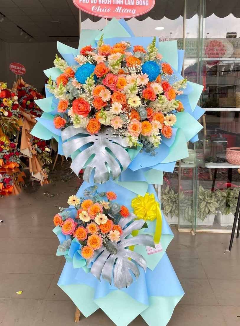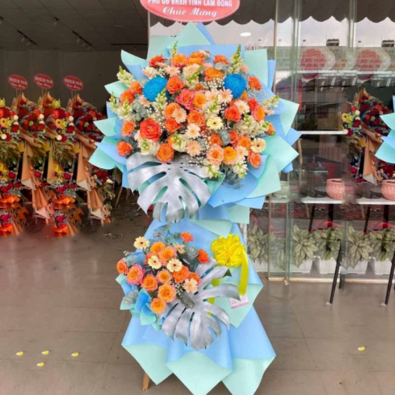 Kệ hoa chúc mừng khai trương, hội nghị tông xanh và cam nổi bật
