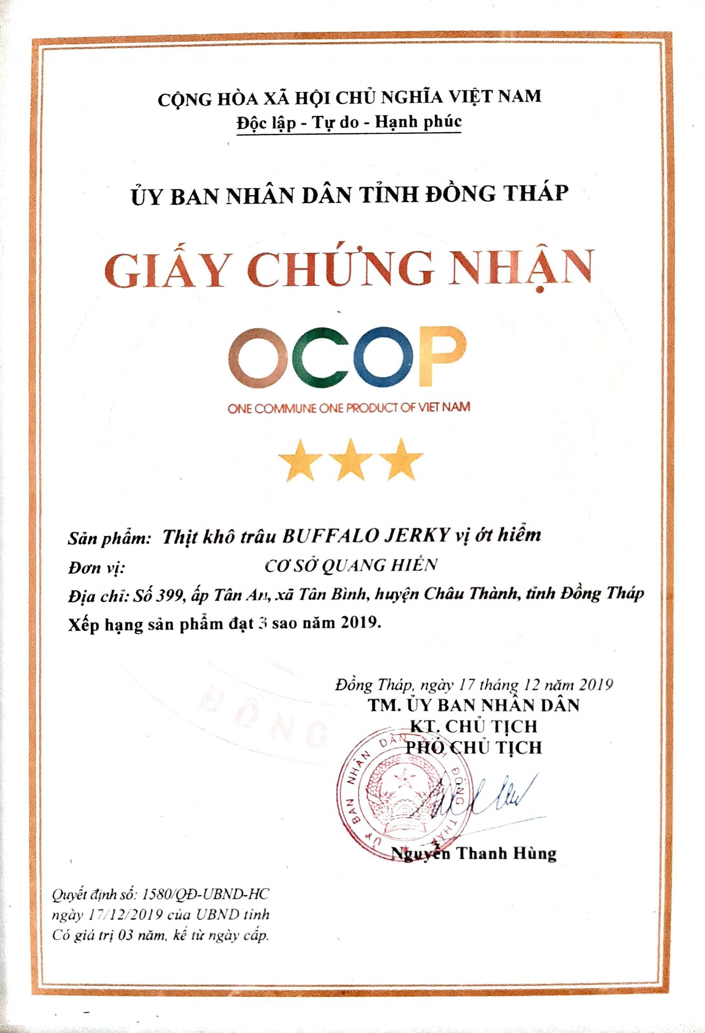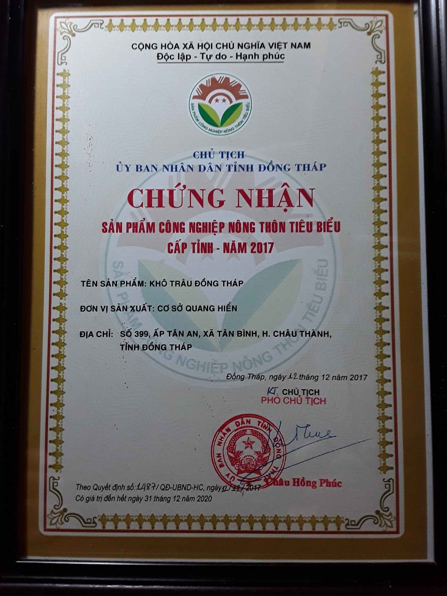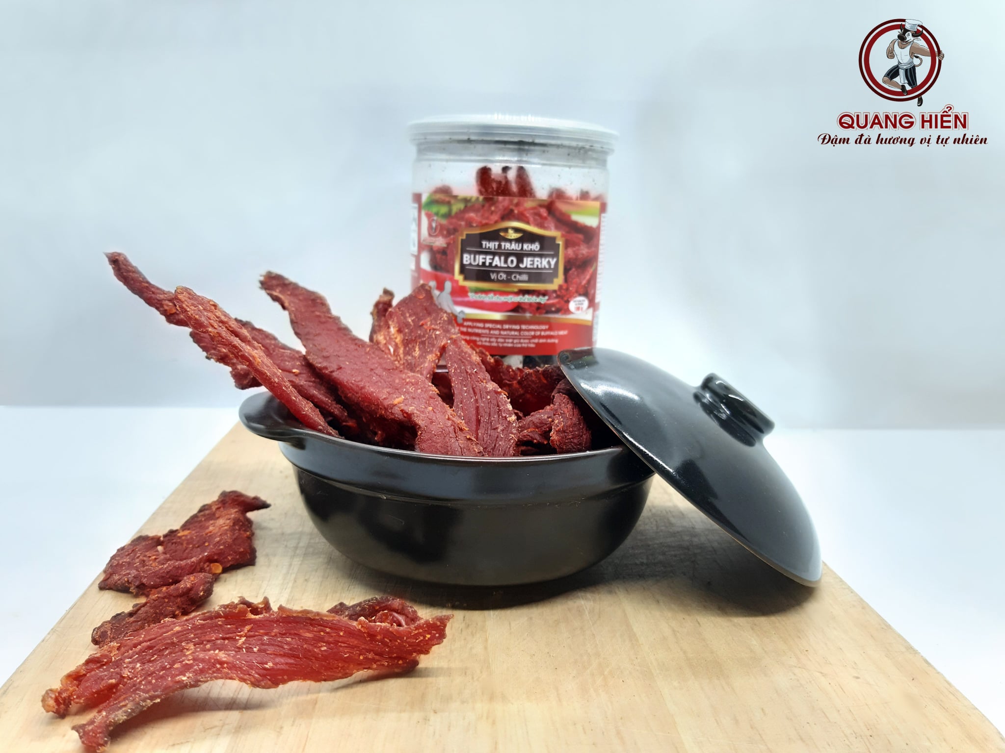 Quang Hiển Food được thành lập vào năm 2017 tại xã Tân Bình, huyện Châu Thành, Đồng Tháp. Cơ sở chủ yếu hoạt động chính trong mảng sản xuất, kinh doanh các sản phẩm chế biến từ thịt trâu như: Khô Trâu truyền thống, Thịt Trâu 1 Nắng, Khô Trâu ăn liền, Thịt bò xông khói, Snack da cá sấy giòn. Các sản phẩm sử dụng nguồn nguyên liệu tươi ngon từ thịt trâu đồng bằng, là trâu được nuôi chủ yếu ở Đồng Tháp và một số tỉnh lân cận như Long An, Vĩnh Long, An Giang. Da cá được lấy từ cá tra sông Mekong với chất lượng tuyệt hảo và dinh dưỡng cao….. với công thức gia truyền đảm bảo giữ lại trọn vẹn độ tươi ngon của các loại nguyên liệu và được chế biến theo quy trình sản xuất hiện đại đảm bảo ATVSTP.